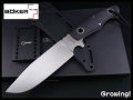 | ダイス鋼のD2、素直な研ぎ味とバリの少ないキチッと立つエッジは流石。このナイフは研ぎ角がオリジナルではかなり鈍角。30度くらいか。鋭い代わりにチップしやすいこの材質には、ある意味この角度がふさわしいのかもしれない。鈍角でもきちんと研げば生毛くらいさらっと剃れるので、実用上問題なし。特筆すべきはハンドル形状。3次元レベルで、とてもよく考えられた造形。ちゃんと薬指と小指に、どんな握り方でも力が入る。コレって、当たり前に必要な事なのに、結構できてないナイフが多い。このナイフは狩猟に釣りにキャンプに、活躍してくれると思う。 | ||