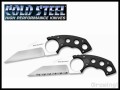 | まずコールドスティール社のナイフは実用本位ですね。シース も小型でロックもしっかり掛かります。唯左利きには使いにくいかもしれません。セレーションは独特で、一般のシャープナーではお手上げです。 |