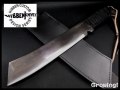 | レプリカとしては90点以上の出来だと思います。 公式レプリカよりも重厚で原作再現度が高い。 ただし実用品としては、使い物になるか疑問です。 以下は私見です。ロットにより違いもあるかと思いますので参考までに。 まず切先から4~5cm部分について、満足に焼きが入っていませんでした。 機械的な熱処理をしたのか直線状に焼きが入っており、その直線が持ち手から切先5cm程度の部分までしかカバーしていないのです。 この硬度差は砥いでいる感触でわかるほどでした。 焼きの甘い先端付近が竹程度の固さの物体に当たるとおそらく1発で刃がめくれます。 また、それ以外の部分の刃についても普通に砥いだだけでチッピングが目立ちます。 鉈としては粘りが足りない。 これは鋼材自体があまりよろしくないのが原因だと思われます。 以上のことから研ぎの段階で実用は厳しいと判断しました。 もし実用するなら必ず予備の道具を持つべきです。 このナイフ1本に頼る状況を作ってはいけません。 |