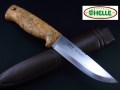 このナイフのブレードはメインブレードを18/8ステンレスで挟む3層構造で箱出しで産毛が切れる切れ味です。ハンドルはバーチ材の中でも高価なカーリーバーチを使用しています。木目のきれいなハンドルです。ブラウンレザーのベルトシースが付属します。