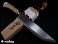 | まさに和包丁、片刃の特大出刃に大きな木の柄が付いた感じで迫力満点です。 紹介通りの実用本位の野鍛冶製品です、箱出しでよく切れます。 佐治武士さんの両刃の山刀とは全く趣が違います。 叉鬼山刀は最近特に入手しにくいとの事で、使用目的なしの収集品にと購入しました。 |