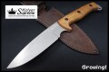 | ハンドルの色が写真や動画では、明るい茶色でしたが実際に届いた商品は、濃い紫がかった暗褐色の、落ち着いた色合いでした。ウォルナット、胡桃材の特徴として、含まれるフェノール酸化酵素の働きで、作りたては明るい色合いが、空気に触れることにより変化するとのことで、さらに年数がたつと、色合いが穏やかに変化するそうです。 自然素材なので、個体差があるし経年変化を楽しみたいと思います。さわり心地もよいですよ!! 使用鋼材のPGK鋼は、成分組成表を見るかぎりでは日立安来金属の青紙2号鋼に、Cカーボン、wタングステン量が近しい。それにモリブデンMO1.5 焼き入れ性アップ、バナジウムV1.95靱性と硬化性アップ、クロムCr8.5耐腐食性アップした鋼材。 実際、青紙2号鋼と同等の切れ味を示しました。 和式刃物と違い一枚鋼なので、靱性と耐腐食性を向上させた鋼材だと思います。しかしクロム8.5%では、炭素鋼に比べて若干サビにくいというだけで、メンテナンスをしっかりしないとサビると思います。 ナイフの表面仕上げは、写真だとテフロンコートの様な色合いに見えたが、PGK鋼の色そのものでCrの不動態被膜の色と炭素鋼の色の中間色です。フルフラットグラインド面に刃に対し、直角方向に極細なヘアーラインが残っており、仕上げは実用刃物のレベルです。 シースは革厚で、クオリティーも高い。しかしナイフを抜くのはスムーズに抜けるのだが、ナイフを、おさめるときにフラットグラインド面とチョイルの段差にシースがひっかかり、おさめ辛く手間取ることが多いです。革シースは、趣があってよろしいが雨水、泥汚れ、キズに気をつかうし私の使い方だとカイデックスシースの方があっているので、いずれ自作したいです。 このナイフの特徴は、ドロップポイントでフルフラットグラインド、長いチョイル20mm、刃厚があり、切れ味の良い鋼材、頑丈なフルタング構造なのでキャンプでの料理ブッシュクラフトすべて、これ一本で用が足ります! ショップの対応はいつも迅速丁寧で、商品説明は適切でわかりやすく、とてもよろしいです。また良いナイフとの、出会いを楽しみにしています。 |