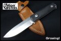 ライオンスチール社のブッシュクラフトナイフです。ハンドル部分の鋼材はオンレイしているハンドルより若干大きめのサイズに作られており丁寧に面取り加工してあります。使い勝手の向上には有効ですがファイヤースターターが削れない欠点があります。しかし当モデルはハンドルエンドが一部フラットに作ってありファイヤースターターを削ることができます。付属するシースは大変しっかりと作ってあり使い勝手が良いです