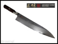 精密で近代的な波目模様に対し、手造りの趣を感じさせる槌目模様のブレイドです。表面は食材が映り込む程美しい鏡面に仕上げられています。ブレイド材は波目も酔うブレイドと同様、高級刃物鋼であるVG-10を使用しています。本焼き、本刃付けにより長切れします。