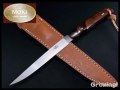 切れ味抜群の細くすらりと伸びた薄手のブレードには「HAND MADE KNIFE MOKI」の文字がプリントされています。モキのナイフは箱出しで産毛が切れる最高の切れ味です。フルタング構造で頑丈なつくりです。ハンドルは木目の綺麗なココボロを使用しております。しっかりとした作りのレザーベルトシースが付属します。