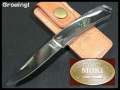 大変美しいミラーフィニッシュのブレード。モキのナイフは箱出しで産毛が切れる最高の切れ味です。ハンドルもきれいに磨き上げられたミラーハンドルにあわびがインレイされております。大変精度の高いバックロック方式のロックシステムで精度高くカチリと心地のよいサウンドが響き、音も楽しむことが出来ます。モキのコーポレートマークの入ったレザーのベルトシースが付属します。