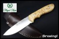 | ショップは、当然星五つです。ナイフは、やはり価格に 反映されてますね。ブリサやカストロムと違いカーリーバーチの材質が、いまいちですね。柔らかいうえに面が荒れており、ペーパー掛けしオイルアップすれば、どうしても、色が濃く出過ぎたため、脱脂し蜜蝋でやりなおしましたが左右の紋様が違う為、少し残念な気もあります。しかし、グリップは、TBSボアに非常に似ており、握りが良いです。鋼材が鋼材だけに、ガシガシ使うナイフではありませんが、キャンプナイフとして重宝しそうです。美術品でなく使ってなんぼのナイフと思いました。 ソフトな面で活躍しそうなナイフとも思えました。 |