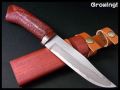 多層鋼 ダマスカスブレードは刃紋が大変きれいです。両刃でハマグリ刃に仕上げられており切れ味抜群です。ハンドルとは樫に滑りにくいよう鮫革を巻き、朱塗りに仕上げ、味わい深いナイフに仕上がっております。和のテイストがバンバン伝わってきます。