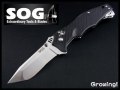 SOG社開発の「ヴァルカン」もそれに違わず構造ががっしりと強固である。「ヴァルカン」にはもはや何の弱点も見出せない。SOG社パテントのアークロック、ステンレスライナーで内側を補強されたザイテルハンドル、3mmの厚さを誇るスピアポイントブレード、これら全てを纏った「ヴァルカン」はもはや完全無欠のナイフとなった。さらに、このナイフの最大の特徴はブレードにアゴを付けたことにある。ナイフを閉じた状態でそのアゴを親指でキックすればブレードを楽に回転させることができる。左右取替え式ポケットクリップ、両サイドから操作可能なアークロック、ダブルブレードボタンは正に右利き、左利きどちらでも使いこなせる卓越のナイフである。ご要望に答えて少し小振りのヴァルカン小登場。