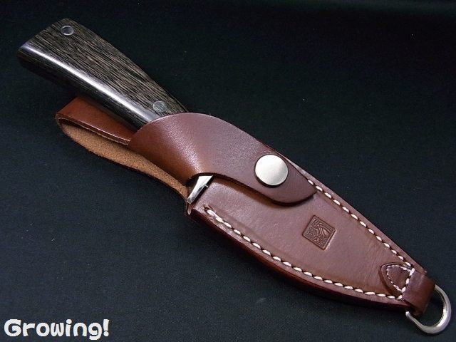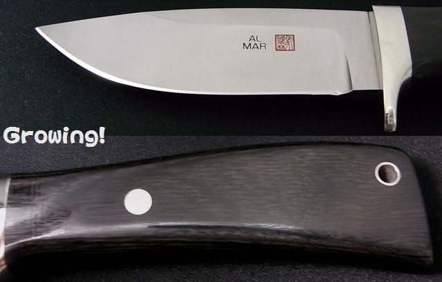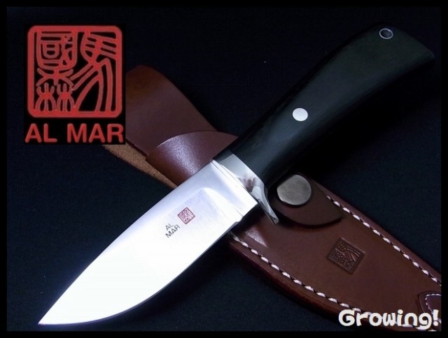 きれいにホローグラインドされており切れ味抜群のブレードにはAL-MARのロゴが入っております。ハンドルはブラックマイカルタ。しっかりと作られたレザーシースが付属します