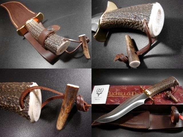 刃厚 約4.5mmの迫力ある大型のブレードは勇ましくそそり立っており大変 精悍ですが、なんといってもこのナイフの特徴は上質の太いスタッグを使用している事です。ハンドルエンドの直径は4cmを超える太さです。実際に手に取ると太いくらいのハンドルですが取り回しも良くバランスもすばらしい印象です。ブラス製のヒルトはスタッグハンドルと隙間なく仕上げられており製品のクオリティーの高さが伺えます。レザーのランヤードにはスタッグの先がアクセサリーとしてつけられております。レザーシースが付属します