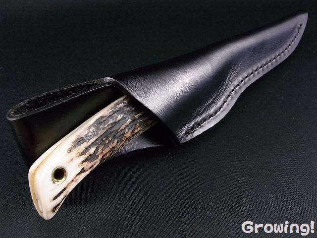 高級鋼材ATS-34を使用したブレードは丁寧にホローグラインドされており切れ味抜群です。ブレードバックにセレーションが付いていますので人差し指を添えてコントロール良く使用することが出来ます。ランヤードホール付。使い勝手の良いポーチタイプのレザーシースが付属します。