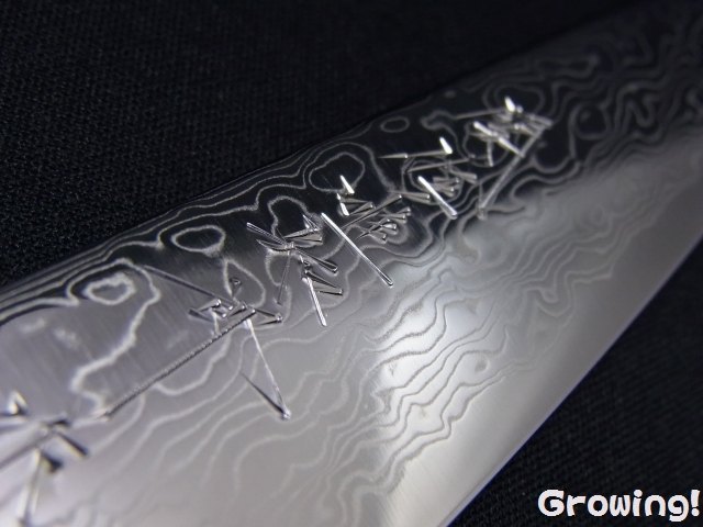 シャープな切れ味と耐蝕性定評のあるステンレス系刃物鋼V金10号を切刃に、ニッケルとステンレスを63層に重ね合わせた、刃物鋼に仕上げました