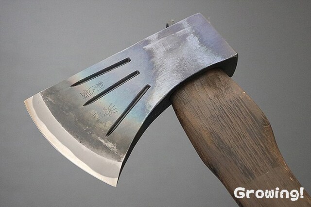 伝統的な斧の刃には、左に3本、右に4本の筋が刻まれています。これは、危険な山仕事の最中、事故に遭わないように八百万(やおよろず)の神々と共に在る、という信仰から刻まれたものです。