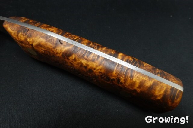 また、ハンドルのカーリーバーチ模様は本当に美しいです。燃えるような炎柄と虎杢目はまさに芸術品です。