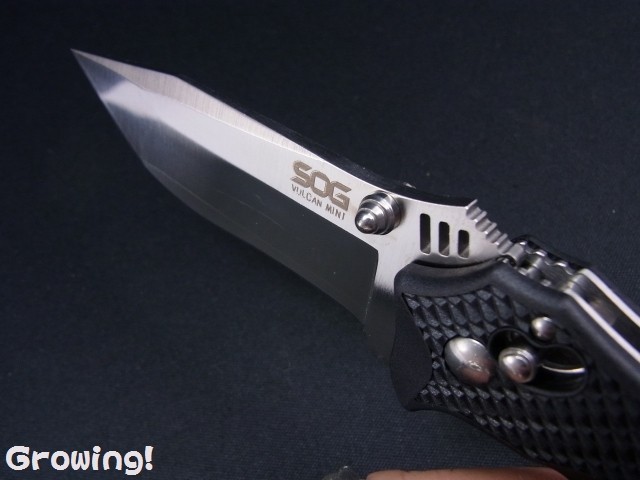 SOG社開発の「ヴァルカン」もそれに違わず構造ががっしりと強固である。「ヴァルカン」にはもはや何の弱点も見出せない。SOG社パテントのアークロック、ステンレスライナーで内側を補強されたザイテルハンドル、3mmの厚さを誇るスピアポイントブレード、これら全てを纏った「ヴァルカン」はもはや完全無欠のナイフとなった。さらに、このナイフの最大の特徴はブレードにアゴを付けたことにある。ナイフを閉じた状態でそのアゴを親指でキックすればブレードを楽に回転させることができる。左右取替え式ポケットクリップ、両サイドから操作可能なアークロック、ダブルブレードボタンは正に右利き、左利きどちらでも使いこなせる卓越のナイフである。ご要望に答えて少し小振りのヴァルカン小登場。